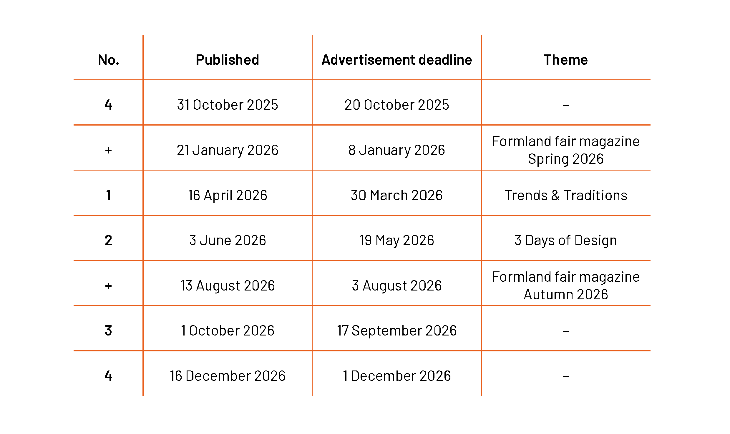 365DESIGN issues no. 1 and no. 2, as well as the Formland fair magazines, are published in larger print runs, as they are distributed to exhibitors and visitors at Trends & Traditions, 3 Days of Design, and Formland, respectively.